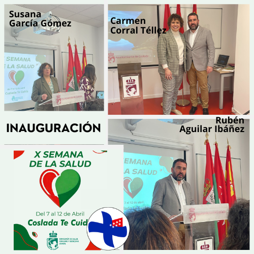 La Concejalía de Salud, Consumo y Bienestar Animal del Ayuntamiento de Coslada presenta, del 7 al 12 de abril, la X SEMANA DE SALUD, en la que participa el Colegio Profesional de Higienistas Dentales de Madrid a través de diversas charlas de educación para la salud bucodental. Con el lema “Coslada te cuida”, ayer, 8 de abril, se celebró el acto oficial de inauguración con D. Rubén Aguilar Ibáñez, Concejal de Salud, Consumo y Bienestar Animal, y Dª. Susana García Gómez, Jefa de la Sección de Acción Municipal de la Dirección General de Salud Pública.