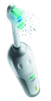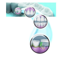 Los estudios de laboratorio muestran que la actividad de dinámica de fluidos generada por el cepillo Sonicare Elite de Philips puede eliminar la placa bacteriana hasta 2-3 mm más allá del alcance de sus cerdas3. El cepillo mezcla agua, pasta dentífrica y saliva para formar en la boca una espuma penetrante que ayuda a interrumpir y a eliminar la placa bacteriana entre los dientes de manera profunda, por debajo de las encías y en lugares de difícil acceso. Esto es posible porque el cepillo Sonicare Elite genera cada minuto 31.000 movimientos de cerdas con una gran amplitud, lo que provoca una considerable actividad dinámica de los fluidos en la boca. De hecho, incluso 15 segundos de contacto directo con la placa