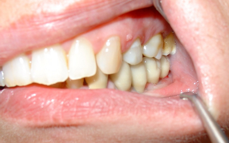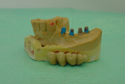 Siguiendo el protocolo de actuación, se hace la historia clínica, la ficha implantológica, se solicitan análisis de laboratorio de rutina y una ortopantomografía, así como periapicales de la zona.se toman impresiones superiores e inferiores con alginato y se vacían en yeso piedra. Se toman registros con la ayuda de un arco facial y se montan los modelos en articulador semiajustable. Después del análisis de los modelos y de las radiografías se decide colocar cuatro implantes monoblock Q-implant Trinon de 3,5 mm de diámetro y 12 mm de largo, para ser cargados de forma inmediata por un puente metal-cerámica cementado.(F1)