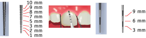 La sonda florida permite la realización de medidas de profundidad de bolsas y recesiones, en la misma actuación o bien, podemos hacerlo de forma independiente. Igualmente, mediante el pedal de control, es posible registrar en la ficha periodontal del paciente los siguientes parámetros: