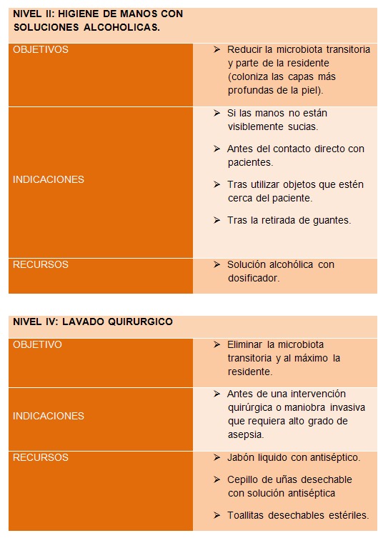- Nivel II: Limpieza antiséptica de manos.