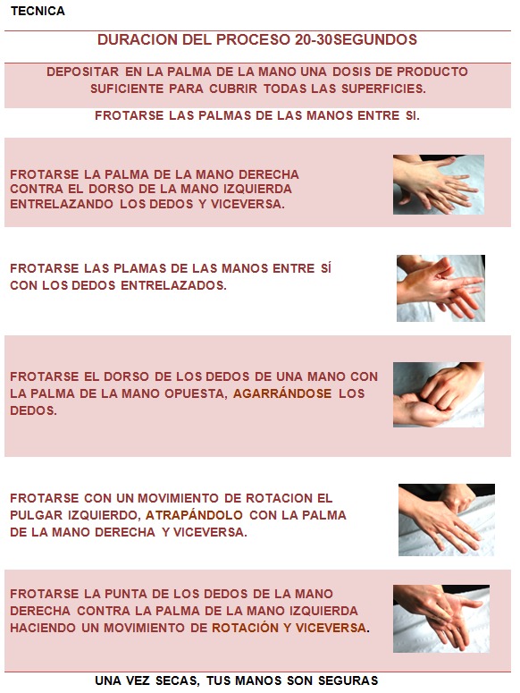 - Frotarse las manos hasta que el producto de base alcohólica se evapore por completo.