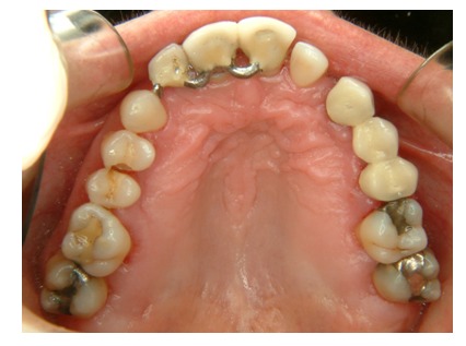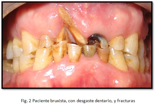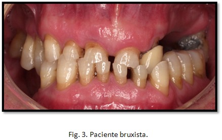 La presencia de guía canina así como dientes naturales participando en la propiocepción es más favorable para el tratamiento. Es por ello que debemos saber que es importante ser cautelosos en un tratamiento de este tipo si el paciente presenta bruxismo moderado o severo. Para ello deberemos explorar la presencia de facetas de desgaste, desgaste dentario, o incluso fracturas. (Fig 2)