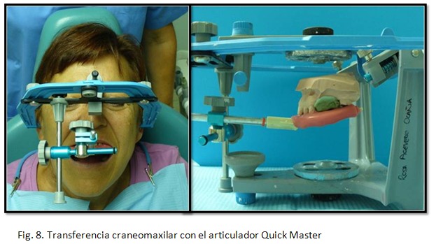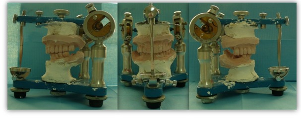 Una vez obtenidos los modelos de estudio, el dentista procederá al montaje en articulador para valorar al paciente tanto estática como dinámicamente (Fig. 5).La elección del modelo de articulador en cada caso depende de una serie de factores, como la habilidad del clínico, el conocimiento de las limitaciones del sistema del articulador, la magnitud de las intervenciones de restauración planificadas y la identificación de los principales determinantes de la oclusión del paciente (relación céntrica, máxima intercuspidación, guía anterior, dimensión vertical, plano oclusal…).Por lo general los articuladores más empleados son los semiajustables con arco facial anatómico5.
