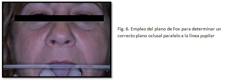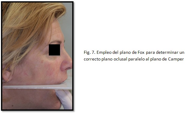 La colaboración del higienista dental es, de nuevo, fundamental para realizar la transferencia craneomaxilar con el arco facial. Si se trata de una paciente desdentada completa habrá que confeccionar una plancha con rodillo de cera para registrar los factores estéticos (línea media, línea canina, línea de sonrisa, reposo labial), y sobre todo el plano oclusal, que debe ser paralelo a la línea bipupilar (Fig. 6), y al plano de Camper (desde porion hasta espina nasal anterior) (Fig. 7) para ello emplearemos el plano de Fox. Tras lo cual tomaremos el registro con la horquilla de cera del arco facial.