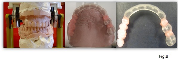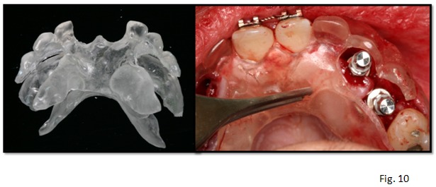 Habitualmente este tipo de férulas quirúrgicas se realizan con una resina transparente, lo que facilitará visualmente al cirujano colocar los implantes en la correcta posición (Fig. 10).Si también va a ser una férula radiológica deberá tener material radiopaco a nivel dentario.