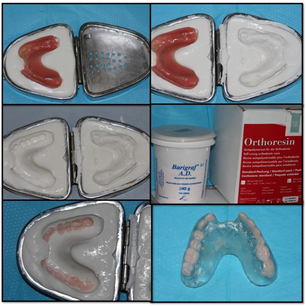 A continuación se rellenar la media cubeta vacía y la parte interior de la prótesis con alginato, cerrando el duplicador, mediante el tornillo de cierre, antes de que el material de impresión haya fraguado. Cuando el alginato está fraguado se abre el duplicador y se retira la prótesis de su interior, obteniendo de este modo la impresión donde elaboraremos la guía quirúrgica final. Utilizando acrílico autopolimerizable, en liquido/polvo, rellenaremos cuidadosamente la parte interna de la impresión realizada, hasta que ésta esté completa de material acrílico.Si va a servir también como una férula radiológica, se añadirá material radiopaco en la base, un sulfato de bario como Barigraf®.