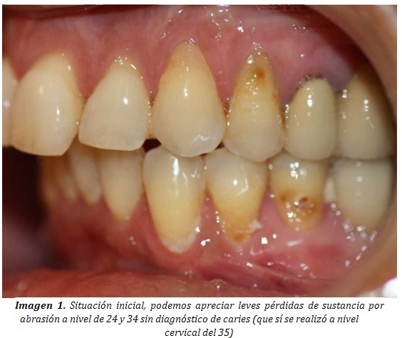 Mujer de 56 años de edad que acude a consulta con desgaste a nivel de 24 y 34 "desde hace unos meses". Después de intentar solucionar su patología con dentífricos desensibilizantes, señala que aún continúa con molestias. Concretamente, refiere hipersensibilidad aumentada a la ingesta de alimentos fríos y dulces, que produce una alteración de sus hábitos alimenticios.