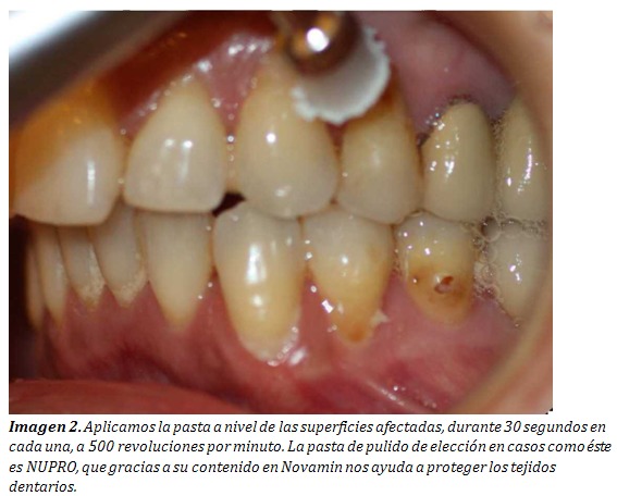 Descartado el diagnóstico de caries en estas dos piezas (que sí se estableció como tal a nivel del 35), y ante la pequeña pérdida de sustancia que se puede apreciar en ambas, optamos por aplicar Seal&Protect para aumentar la resistencia a la abrasión en la superficie radicular expuesta de ambos premolares.