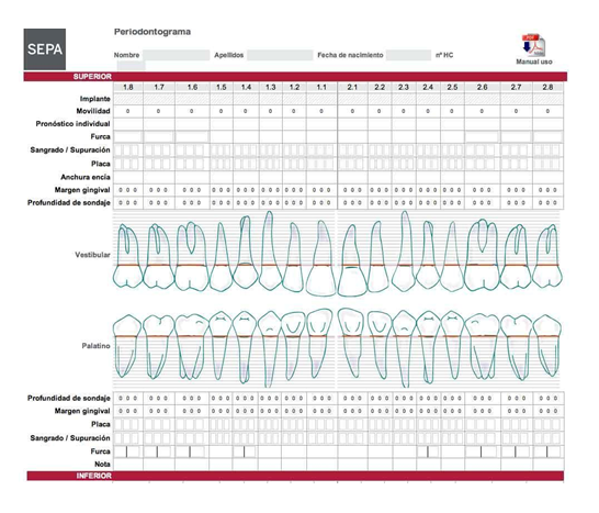 - Exploración periodontal, propiamente dicha. Se debe utilizar una plantilla específica, Periodontograma (Figura 1), para recoger y apuntar toda la información dental y periodontal, y así poder comparar los datos en el tiempo. Incluiremos el registro de: