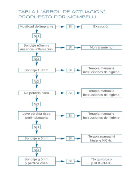 Tabla 1. (Tomado de: Calvo I, Gómez-Polo M, Del Río J, Celemín A. Protocolo actual en la terapia de la periimplantitis. Cient Dent 2012; 9(3):211-216.)