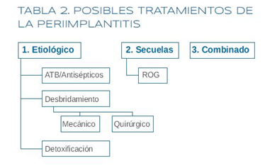 Tabla 2. (Tomado de: Calvo I, Gómez-Polo M, Del Río J, Celemín A. Protocolo actual en la terapia de la periimplantitis. Cient Dent 2012; 9(3):211-216.)