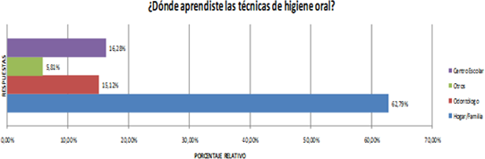 Observando los datos obtenidos en la encuesta, la primera conclusión (Fig.1) es que en la mayor parte de la muestra del estudio, las normas higiénico bucales han sido aprendidas en el entorno familiar (62,79%).