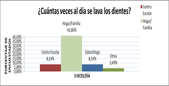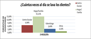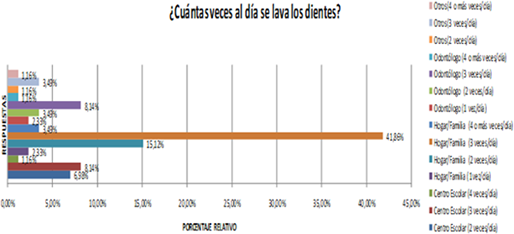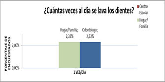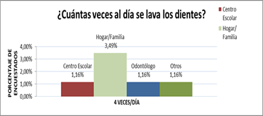En relación al mantenimiento de las normas pasado el tiempo, tomamos como referencia el número de veces que se lavan los dientes (considerándose que la norma correcta y enseñada suele ser de al menos tres veces al día) y lo comparamos con el lugar en que dichas normas se adquirieron, para determinar si el lugar de aprendizaje ha influido o no en su mantenimiento. De este modo, observamos (Fig. 2, Fig 3, Fig 4, Fig 5 y Fig 6) que el mayor porcentaje de limpieza tres veces al día es en aquellos sujetos que aprendieron las normas de higiene bucodental en el hogar (41,86%).
