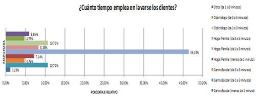 Hacemos la misma comparativa con la variable del tiempo que se emplea en cada cepillado. Observando (Fig. 7) que ningún grupo realiza de manera correcta dicha norma, puesto que el porcentaje total de sujetos que usan un mínimo de tres minutos es de 17,85%, pero en relación al lugar de aprendizaje no observamos ningún dato representativo a este aspecto. Aunque si lo observamos en el grupo de sujetos que aprendieron las nomas en el hogar y que se cepillan de 1 a 3 minutos, ya que suponen el 46,43% del total de encuestados.