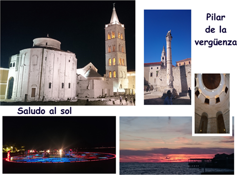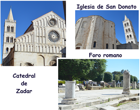 Nuestro siguiente destino es Zadar, ciudad de origen romano con una importante historia que se refleja en sus calles y monumentos, así desde los restos de lo que fue un gran Foro Romano, hasta su Catedral Gótica, destruida y reconstruida por los venecianos, pasando por la Iglesia de San Donato, prerrománica del siglo IX, edificada sobre los restos del foro romano, sobre columnas fragmentadas y sillares y con un interior sobrio, de gran altura, en dos pisos, con ese aspecto cercano al de Santa Sofía de Estambul, con paredes desnudas casi de adornos, sin pinturas ni esculturas y, sin embargo, donde se respira esa paz interior de los grandes monumentos.