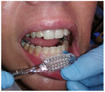 - Enjuagues con flúor diario, si el paciente no es capaz de enjuagarse el tutor mojará una gasa con el flúor y lo pasará por todas las piezas.