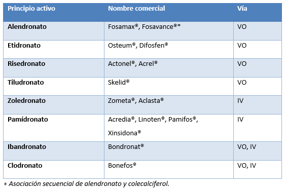 Según la asociación española de reumatología los bisfosfonatos aprobados para el tratamiento de la osteoporosis (OP) son:
