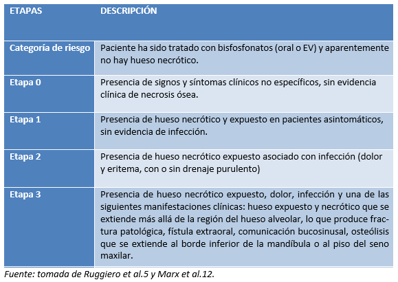 Una vez que aparece la osteonecrosis hay cinco etapas en la clasificación para el diagnóstico de Osteonecrosis mandibular producido por bisfosfonatos propuesto por la Asociación Americana de Cirujanos Maxilofaciales.