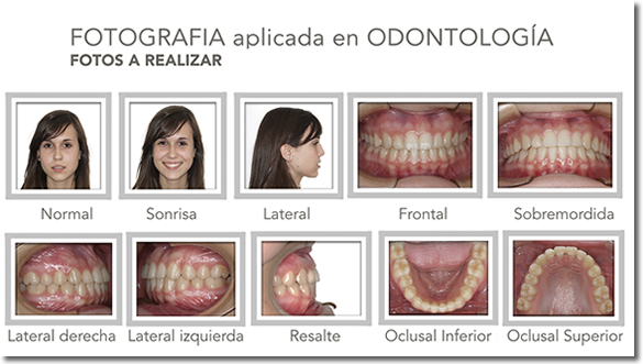 En mi opinión, después de barajar las diversas fórmulas que he observado las diversas tomas que he visto hacer a muchas clínicas de diversas especialidades, las fotografías de primera visita deben ser (como mínimo) las siguientes: