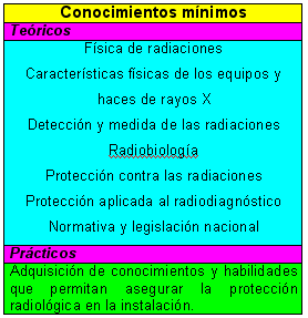 El CSN a través de la Resolución anteriormente citada establece una serie de conocimientos mínimos que es necesario demostrar para poder dirigir u operar según proceda, en instalaciones de rayos X y que se recogen en la tabla 1.